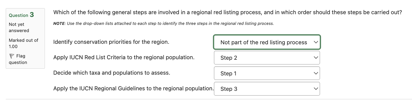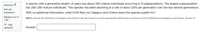 - **Short Answer Questions**: It is very important to read each question carefully before giving your answer. For example: Some answers must be entered as an integer number without decimals (e.g., if "9" is the correct answer, writing "9.13", "nine", or "9 locations" will be marked as incorrect). Some questions require you to enter the appropriate two-letter IUCN Red List Category, and some require the appropriate IUCN Red List Category and Criteria code. Ensure you use the appropriate format when entering these codes (see Annex 2 of the IUCN Red List Categories and Criteria. Version 3.1).