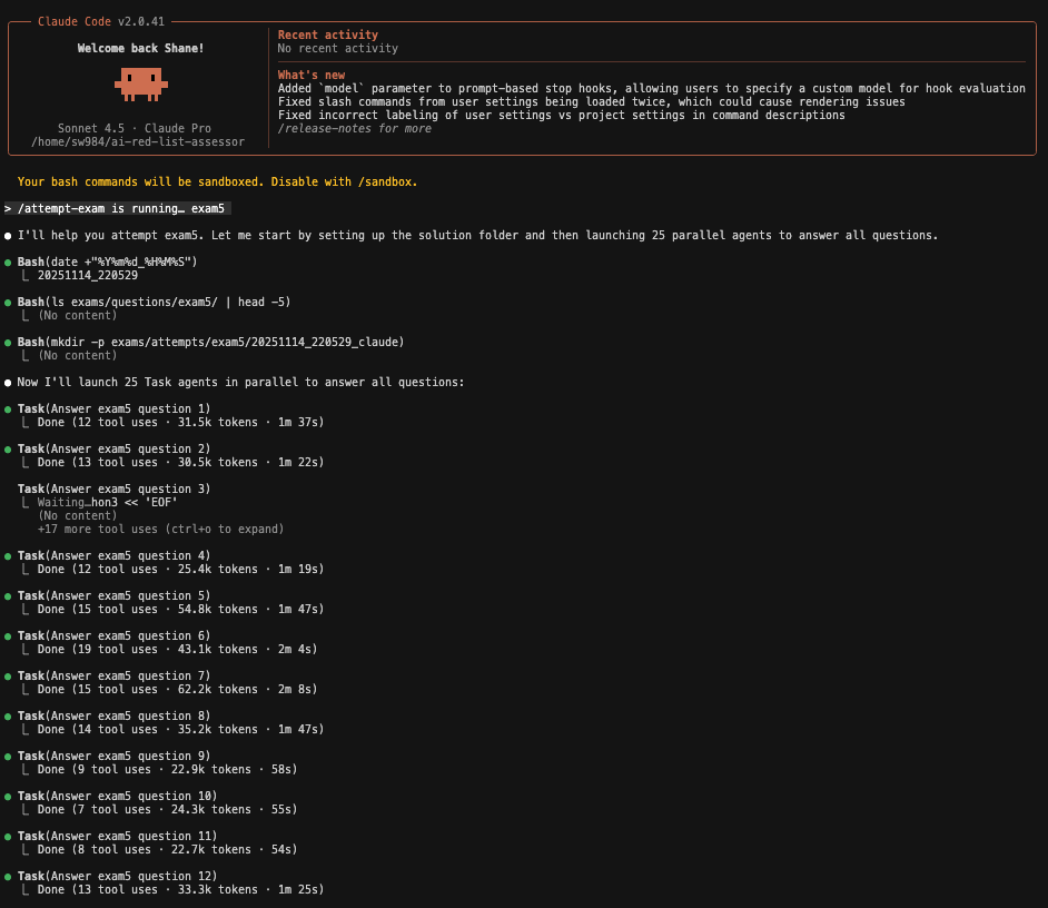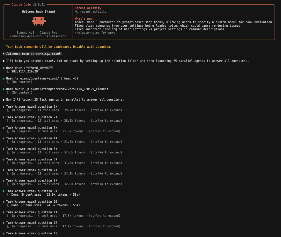 - I then added a `\attempt-exam` slash command that instructs Claude Code to spin out 25 parallel `Tasks` , one for each question, and run `\attempt-exam-question` on each.
